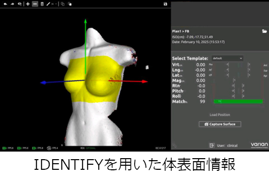 乳がんの術後放射線治療において、従来は体の皮膚にペンで書いたマーキングで位置合わせを行なっていましたが、IDENTIFYを活用して印を用いない位置合わせを行っております。